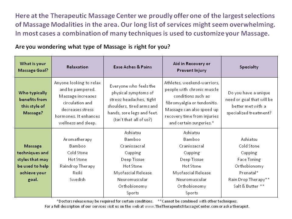 Here at the Therapeutic Massage Center we proudly offer one of the largest selections of Massage Modalities in the area. Our long list of services might seem overwhelming. In most cases a combination of many techniques is used to customize your Massage.